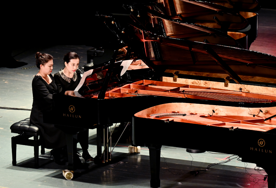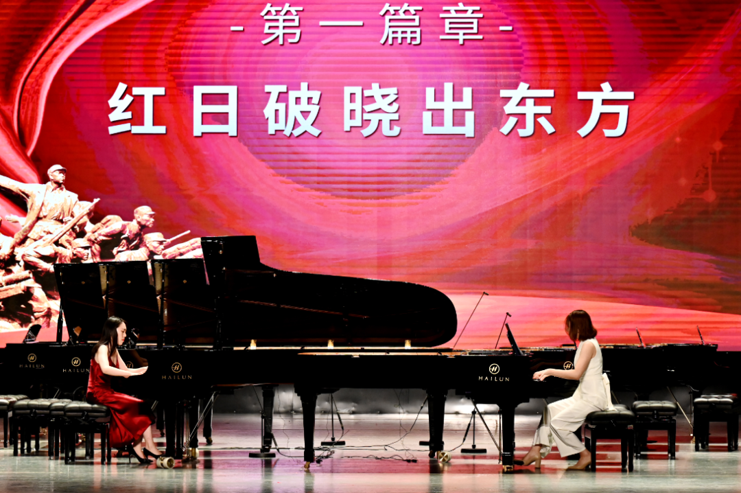 第一篇章“紅日破曉出東方”,雙鋼琴演奏《保衛(wèi)黃河》中,短促跳動、振奮人心的音調(diào)從指尖傾瀉而出,此起彼伏,一浪高過一浪,恰似黃河滾滾奔流,勢不可擋。