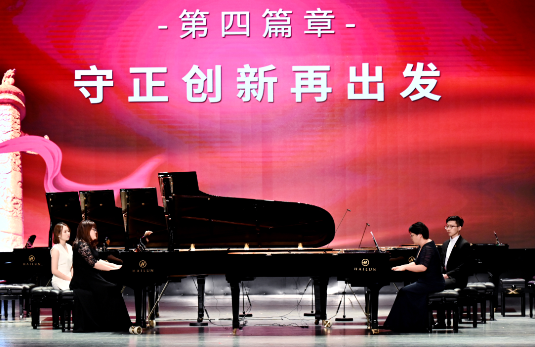 本場紅色主題音樂會根據(jù)黨史時間脈絡(luò),共分為開篇“覺醒新中國”、第一篇章“紅日破曉出東方”、第二篇章“紅色精神耀神州”、第三篇章“改革開放迎春風(fēng)”、第四篇章“守正創(chuàng)新再出發(fā)”、尾聲“啟航新時代”六個部分進(jìn)行。演奏作品極具年代特色,通過多鋼琴齊奏、四手聯(lián)彈、鋼琴薩克斯二重奏、室內(nèi)樂等多類演奏形式,伴隨著每一篇章,帶領(lǐng)聽眾們在音樂中追憶黨史,回味悠遠(yuǎn)的歲月。