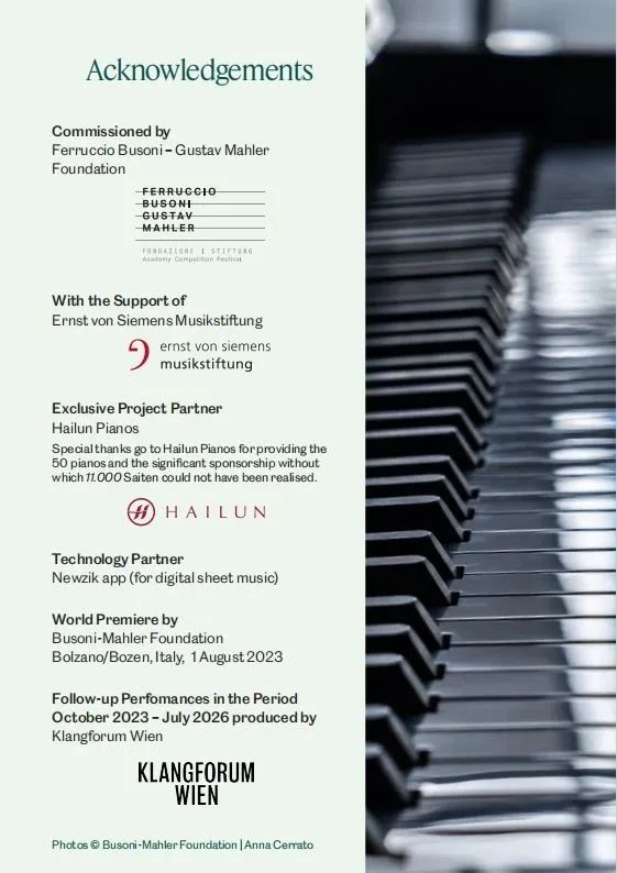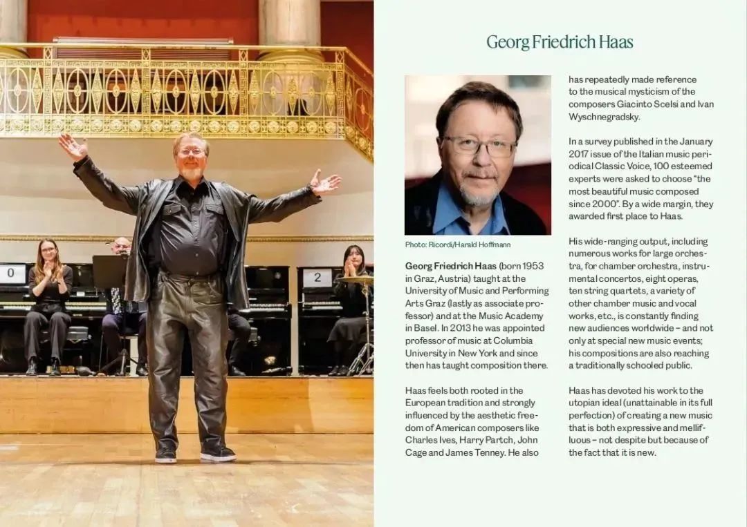 作為世界上最會玩音樂的作曲家,奧地利作曲家喬治·弗里德里希·哈斯(Georg Friedrich Haas)的開創(chuàng)性、藝術性一直備受國際樂屆關注,屢獲國際大獎。在這部由費魯奇奧·布索尼-古斯塔夫·馬勒基金會委托,并在恩斯特·馮·西蒙斯音樂基金會(Ernst von Siemens Musikstiftung)的支持下完成的新作品中,喬治·弗里德里希·哈斯 (Georg Friedrich Haas)開始探索一個可容納50位鋼琴家的微分音音響空間,使用同樣多的鋼琴和一個大型的樂團。