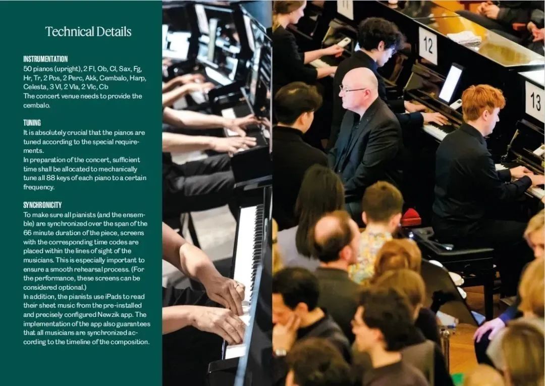這部作品對鋼琴的制造要求十分嚴苛。為了達到預期的音效,50架海倫鋼琴必須完全等效、結構完全一致;鋼琴之間等距離擺放,按照升高或者降低兩音分的差距調(diào)整鋼琴,并且保證每一臺鋼琴的音高保持絕對純律,每一臺鋼琴最后創(chuàng)造出來的剛好是一個半音的差距效果,對鋼琴整音調(diào)律團隊的技術水平也是嚴格考驗。40余天的緊張策劃籌備,90余小時的音律精細調(diào)整,海倫專業(yè)技術團隊協(xié)同歐洲技師一起為音樂演出保駕護航。